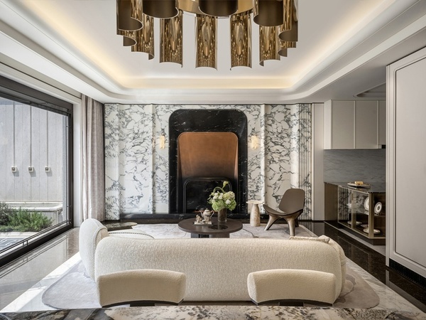 客餐廳以寶格麗紫、宇宙金與漸變銅三種材質構築視覺焦點。紫色象徵高貴與富貴,黑金紋理的奢石如星辰閃耀,搭配金屬與皮革家具,展現現代工藝質感。空間線條簡潔流暢,融入石庫門弧形元素,延續上海的城市文脈。環形吊燈、柔光壁燈與天然大理石共同塑造出優雅的生活節奏,讓居住成為一場關於藝術與品質的日常演繹。