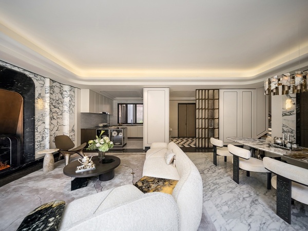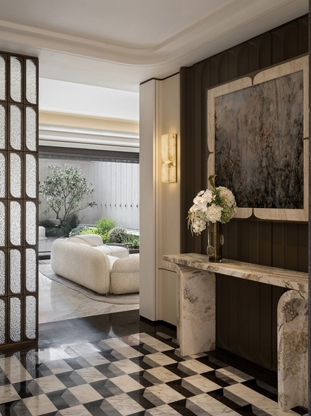 本案室內設計以「海派的東西奏鳴」為主題,融合巴洛克建築與Art Deco設計語彙,交織歐洲古典與現代輕奢。玄關地坪拼花源自巴黎艾菲爾鐵塔結構之美,以黑白幾何強化縱深感,展現古典建築對秩序與和諧的極致追求。牆面拱頂造型取自歐洲古建築廊柱元素,皮革與金屬的對比在光影間交融,帶出海派風格的低調奢雅,為歸家儀式開啟序章。