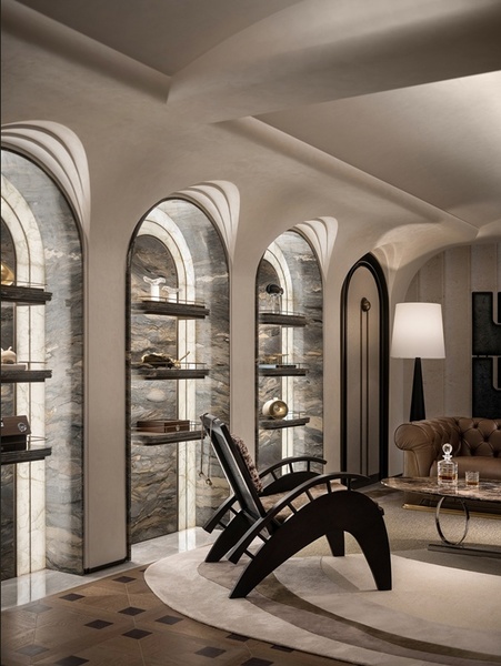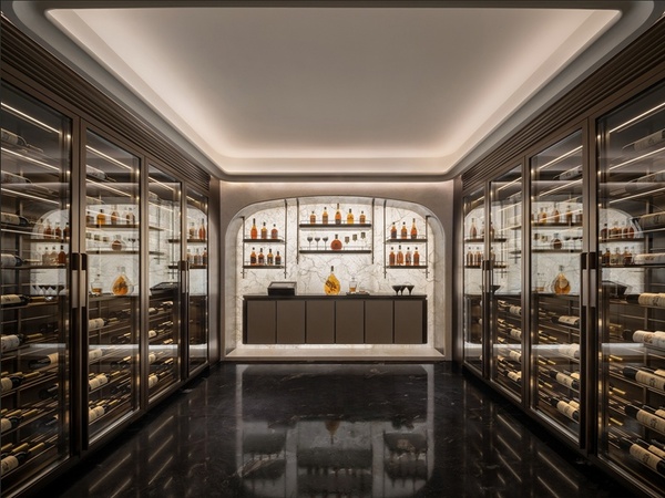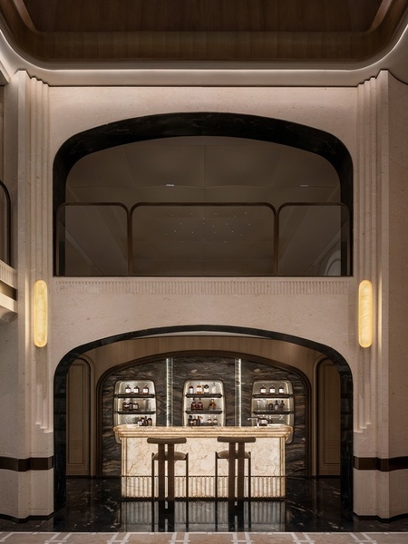 休閒兼品酒區以巴洛克與斯卡帕疊級手法打造,挑高結構與拱形造型形成視覺震撼。拱形門窗象徵圓滿與和順,營造溫暖氛圍與文化歸屬感。透光石吧台映出柔和光感,光影在幾何紋飾間流動,強化空間層次。大理石、金屬與皮革的結合,映襯歐洲古典建築的莊重與現代設計的理性,體現海派的細膩品味,構築古今交融的藝術氛圍。