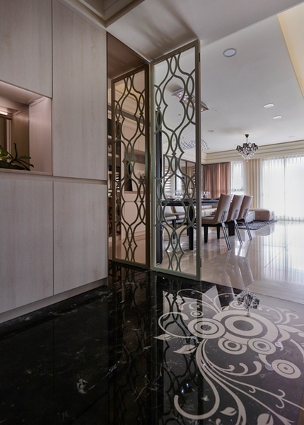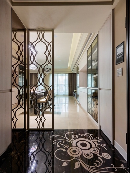 - 家徽端景:玄關地坪及屏風融入專屬圖騰,標誌動線的開端,也刻劃對家的歸屬感。