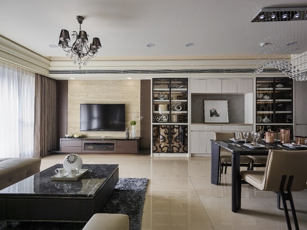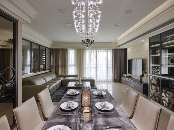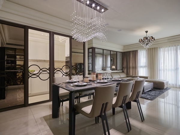 - 光影重奏:餐區燈具以層疊串珠描繪弧形律動,在現代造型中演譯古典美學。