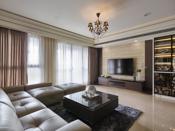 - 核心構築:客廳主牆選用白洞石鋪陳,兩側搭配皮革立面,勾勒公領域沉穩基調。