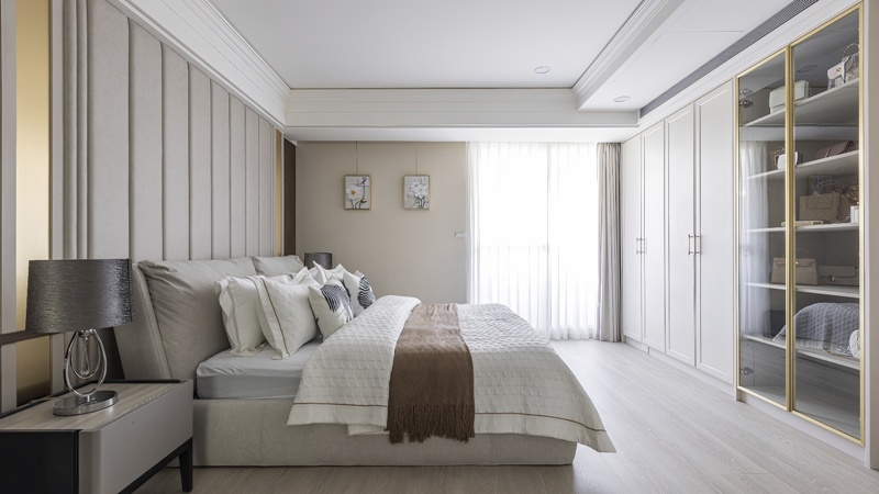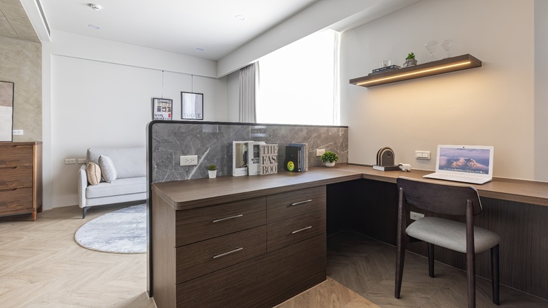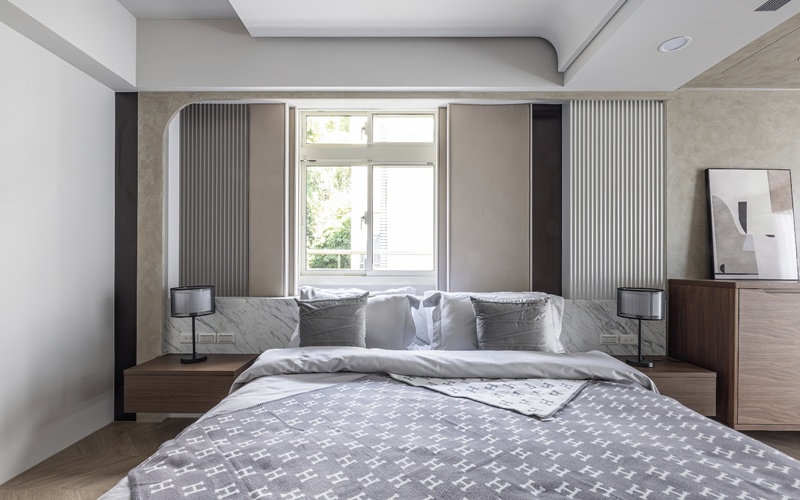 - 材韻層疊:臥房及書房選用深胡桃木與灰色繃布,營造沉靜氛圍。