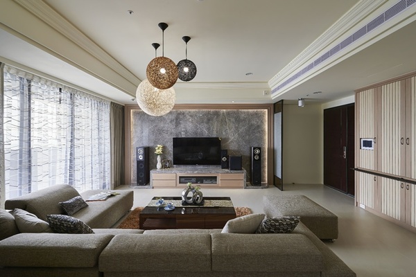 - 石紋定軸:客廳主牆採灰階石材鋪陳,搭配間接光源勾勒輪廓,形成穩定而聚焦的視覺中心。