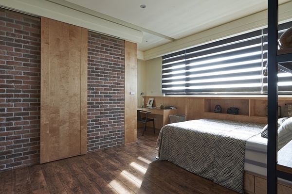 - 木鐵交構:次臥以黑鐵層架結合木質櫃體,收納與展示並存,營造俐落而沉穩的個人調性。