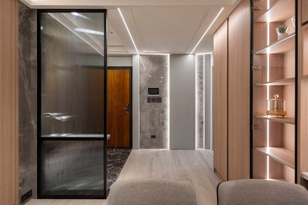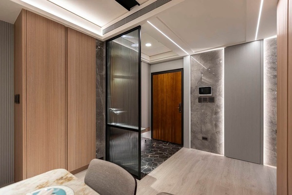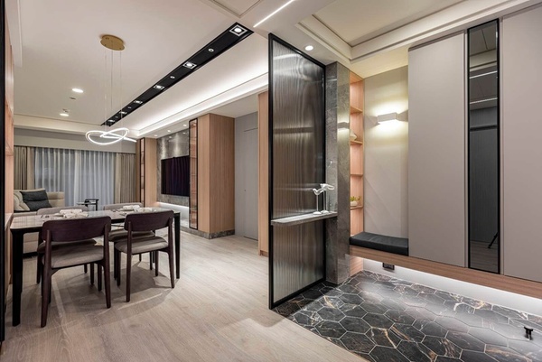 • 玄關敘事:黛黑六角磚鋪陳如黛色山水,搭配長虹玻璃屏風構築層次,兼顧隱私與採光。
