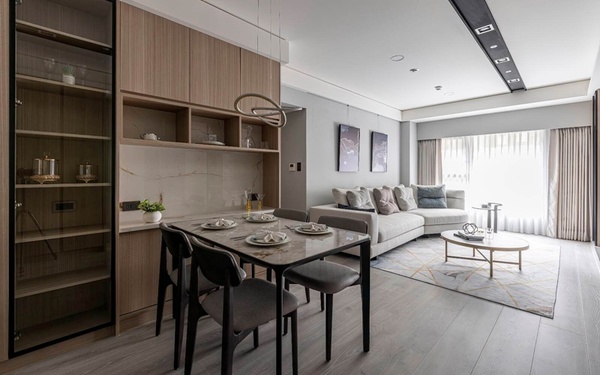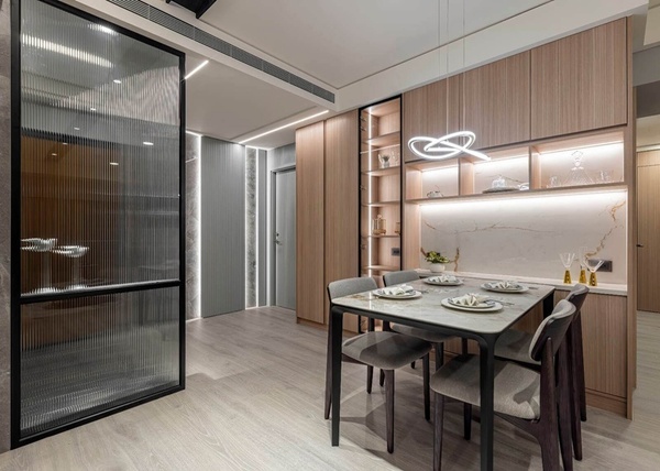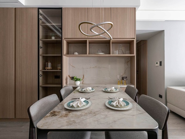 • 餐廚共譜:金質薄石板餐桌搭配整合式木作櫃體,疊映一日三餐一年四季一家人。