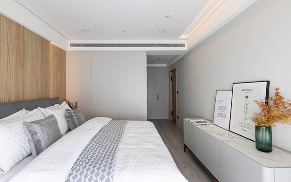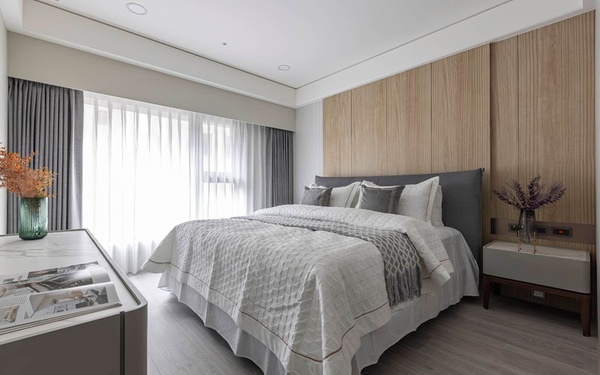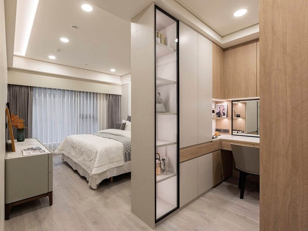 • 隱私空間:主臥以實木皮與立體燈帶勾勒溫潤氛圍,靜靜疊映出精品專櫃精緻質感。