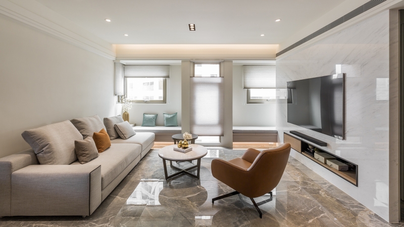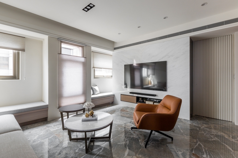 - 藏物隱巧:客廳窗邊規劃掀式臥榻區,滿足大型物件收納需求,讓空間氣象如留白畫作般清亮。