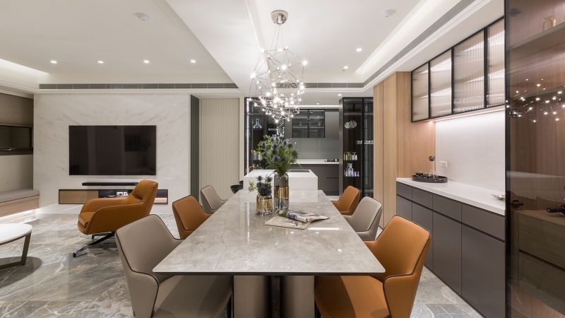 - 餐飲美學:大理石中島與淺灰色石板大餐桌為核心,兩座展示型酒櫃,構築如精品宴席的交流場域。