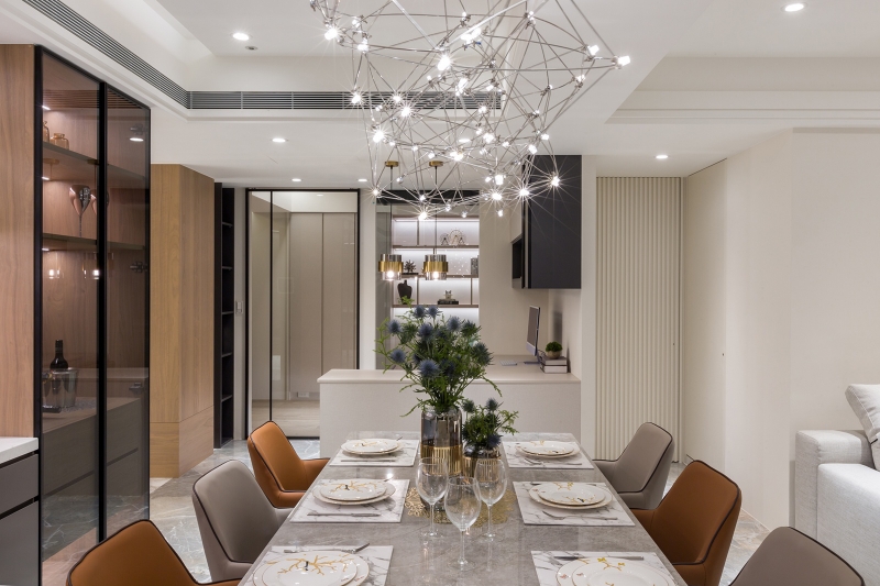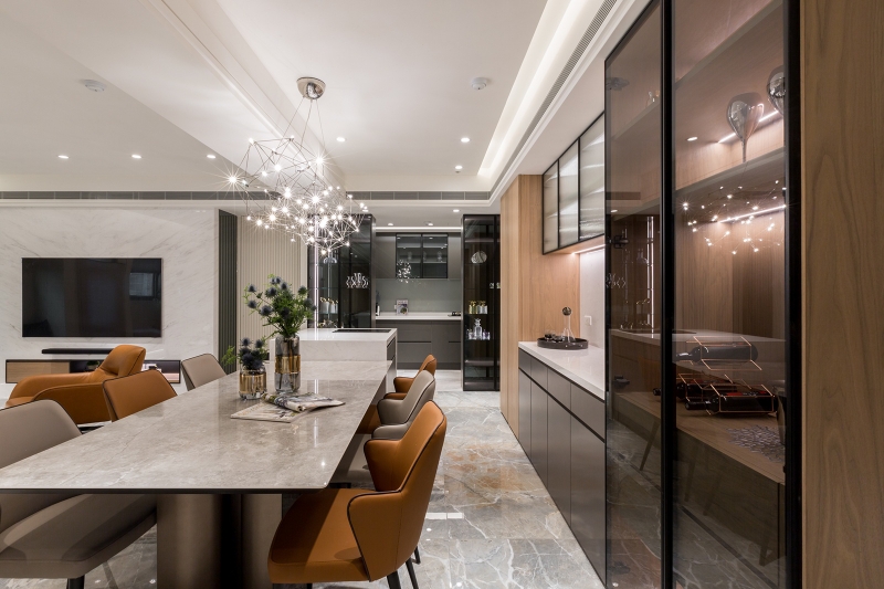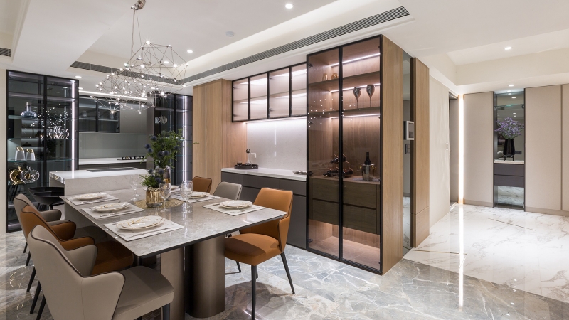 - 視野通透:透過展示酒櫃遮蔽廚房凌亂,一眼望去皆是明亮的舒心視野,展現低奢的秩序美感。