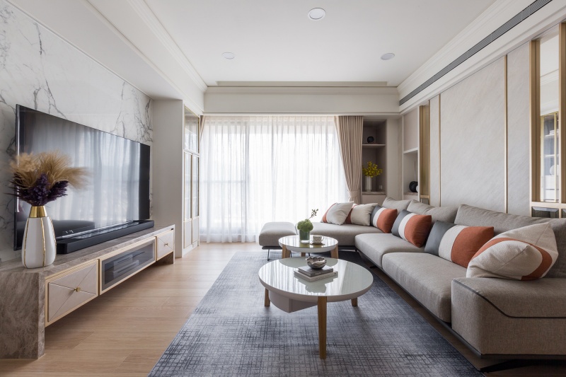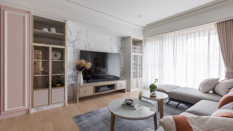 ・美式優雅:客廳電視牆採用石紋拼花與兩側展示櫃,營造出時髦且精緻的視覺焦點。
