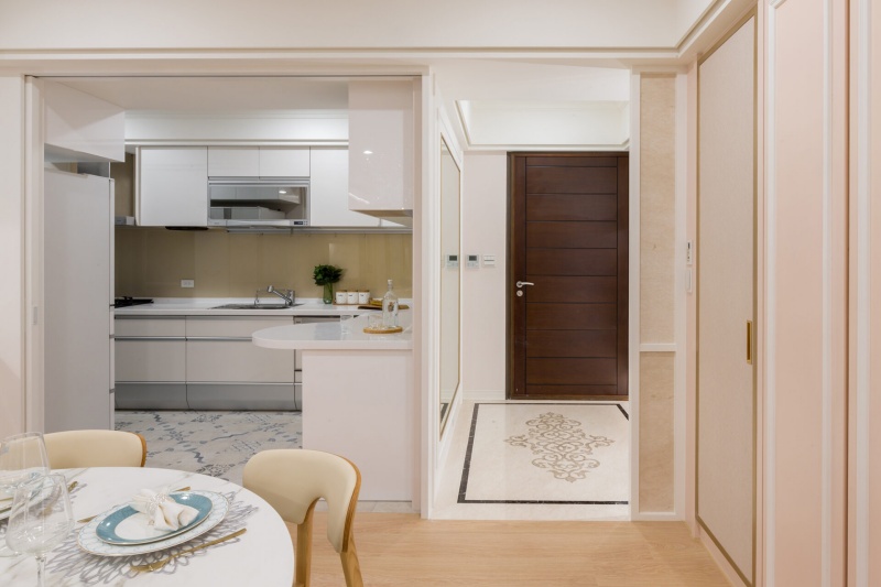 ・機能井然:玄關處配置紫外線消毒櫃與循環扇,搭配九宮格抽屜與茶水櫃,賦予生活極致的便利。