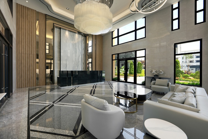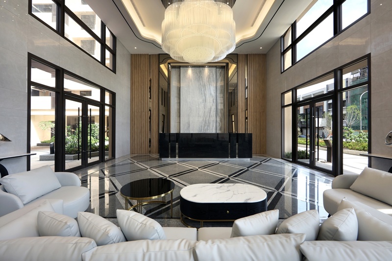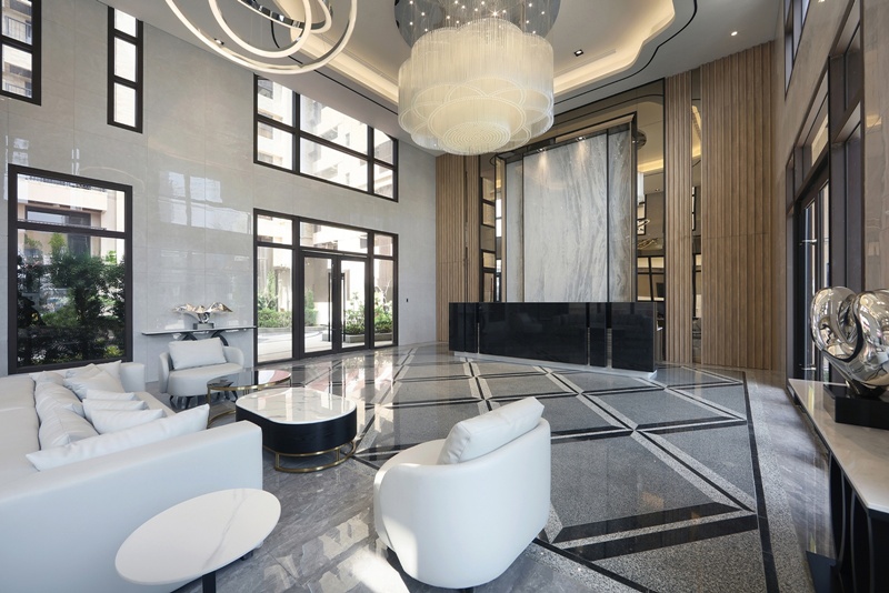 大廳櫃台選用黑色大理石,展現現代質感。隔牆則巧妙將木紋格柵與鏡面錯落拼接,創造通透視覺效果。不僅如此,俐落木板線條搭配金屬鐵件與大理石石材,形塑動態節奏與自在氛圍;潔白天花與花卉意象水晶吊燈則相互輝映,共同激發藝術張力。