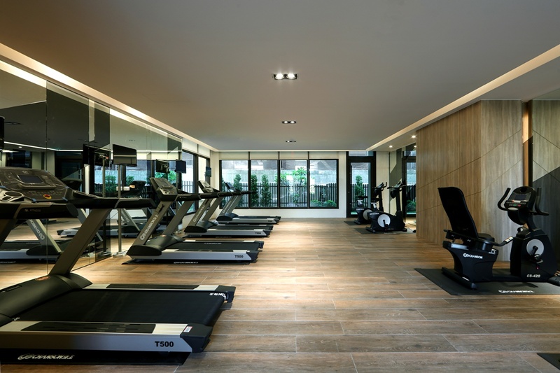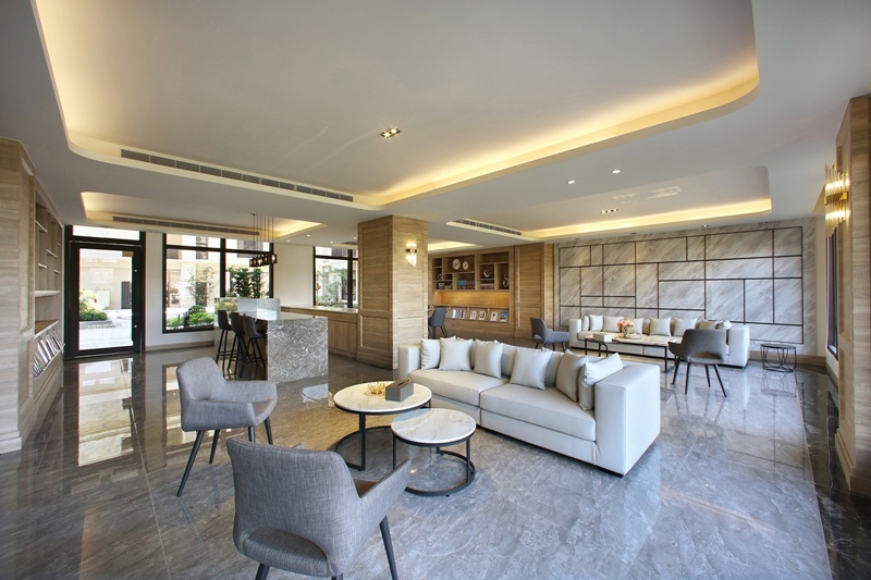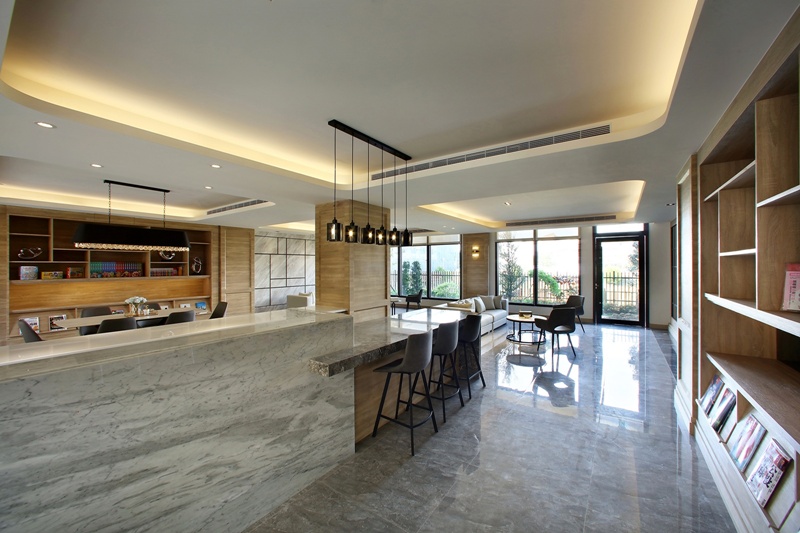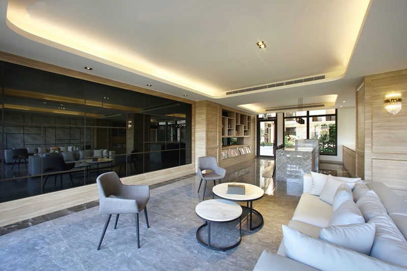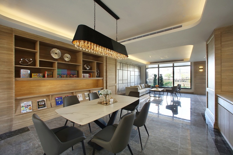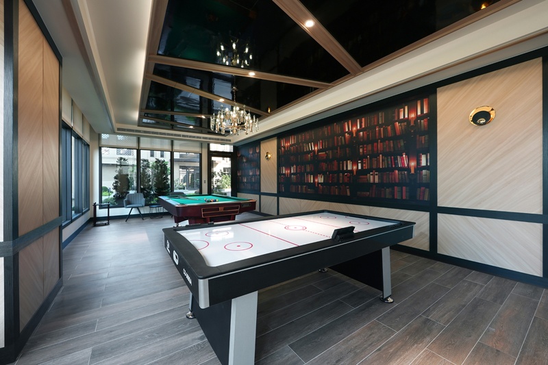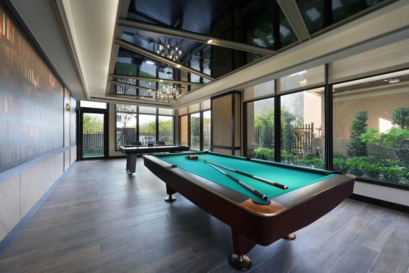 多功能會議室佈局井然,空間開闊且動線自如,配置吧檯、休憩與會議區,既營造咖啡廳氛圍,也滿足閱讀與交流等多元需求,在共享與隱私間取得完美平衡。健身房運用木作線條,結合斜切黑鏡與明鏡,豐富場域層次並增添活力。娛樂室以仿古書牆壁畫呼應大面窗景與水晶燈,讓自然氣息與藝術美感於環境中相互流轉,使休閒之餘亦感受人文底蘊與恬淡自如。