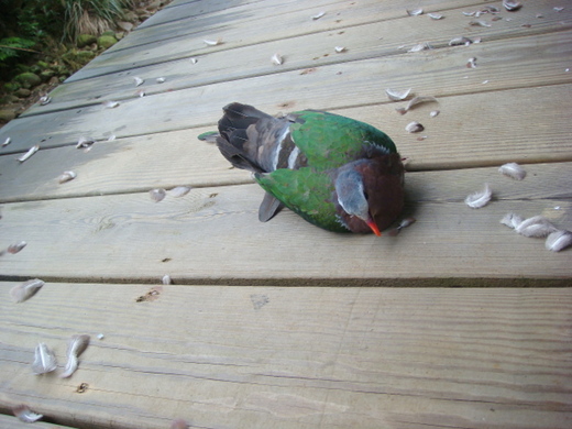 我拾起牠掉落的許多羽毛夾在書頁,唯一一只彩色的羽毛尖端有牠最後一瞥的血跡。