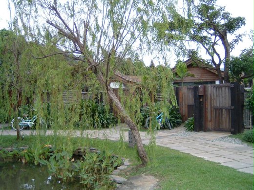 夜宿渡假村特別設計的客舍,矮牆木屋是我們兩日暫時歇憩的處所,那時節春日依依、楊柳青青,旅店小木屋前一池清淺,我等姊妹臨水便是照花人。照著水塘、賞著花色、依著池柳,捕捉到的是那剎那?抑或是從前?