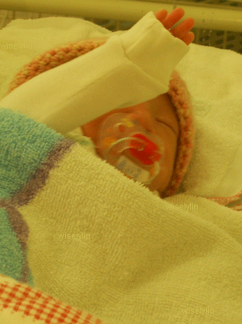 拍攝許多照片,就屬這張特別有趣,她的手原是沒有伸出來的,沒有幾分鐘就掙脫到外面,更與我打招乎,真是佩服她。眼睛一張一闔的,是不是在看爸媽呢?