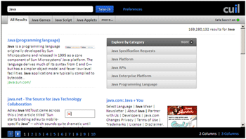 最近一群由Google前員工在28日推出新的搜尋引擎,名為「Cuil」的搜尋引擎,號稱可以找到的網頁內容是目前Google的三倍,可以送出更為精準的搜尋結果。其首頁也與Google相近的簡約風(如圖1),此時我打入「Java」關鍵字,出來的網站就已將熱門的網站資訊已分頁好,快速又簡單的瀏覽(如圖2),讓我佩服不已。
