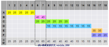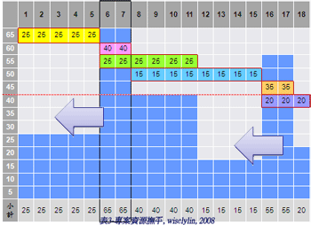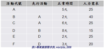 範例,某專案資源需求如表1所示,假設每個人的產能都一樣,且最多可動用人力為40人,在表2可看出來,專案資源在第6日及第7日的人力需求達65人,已超過可動用最多人數40人,所以可參考表3所示,在不超過40人的狀況下,考慮資源的限制及有效利用,對要徑產出的時程進行調整。