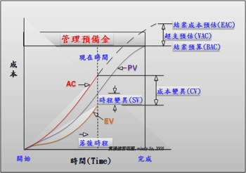 • 實際成本 (Actual Cost,簡稱AC;早期又稱為ACWP ):目前已完成工作耗用多少成本?