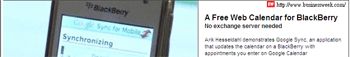 Google推出的Web Application,都會有非常多人拿來比較與相繼開發一些應用,例如運用Google Maps的美食導覽等。但此次為大家分享是來自Businessweek一份不錯影片,運用BlackBerry的Wireless無線通訊功能,將Google Calendar的資料與手機行事曆進行同步。Demo影片中,在Google Calendar建立事件,然後在手機執行(Google Sync)工具,就可以將行事曆進行同步,開起來真的很炫。