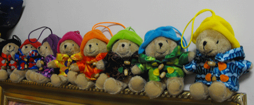 經過兩週來的努力,以及四處蒐集來的點數,也花了一晚的打拼(至少跑了近10家7便利商店),終於將8只柏靈頓寶寶熊收集完畢,排排站自己看了高興,小朋友玩得更高興,看到她對柏靈頓寶寶熊拎著玩、或者排排站,對於自己的辛苦,也忘記了~~