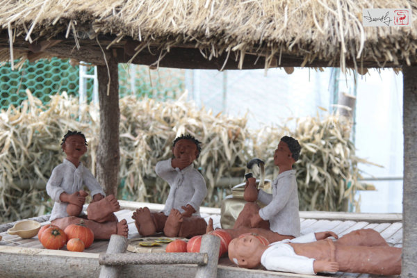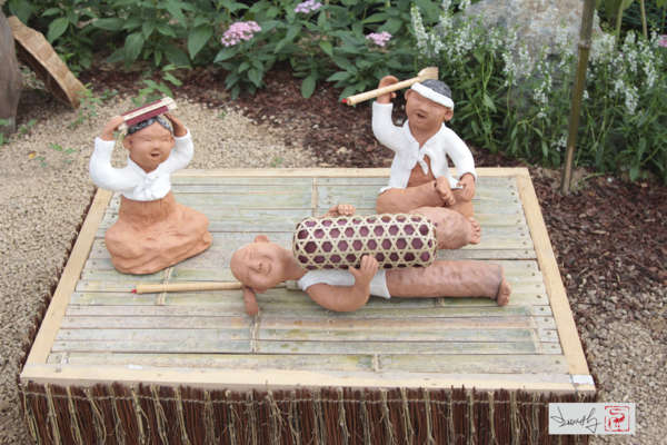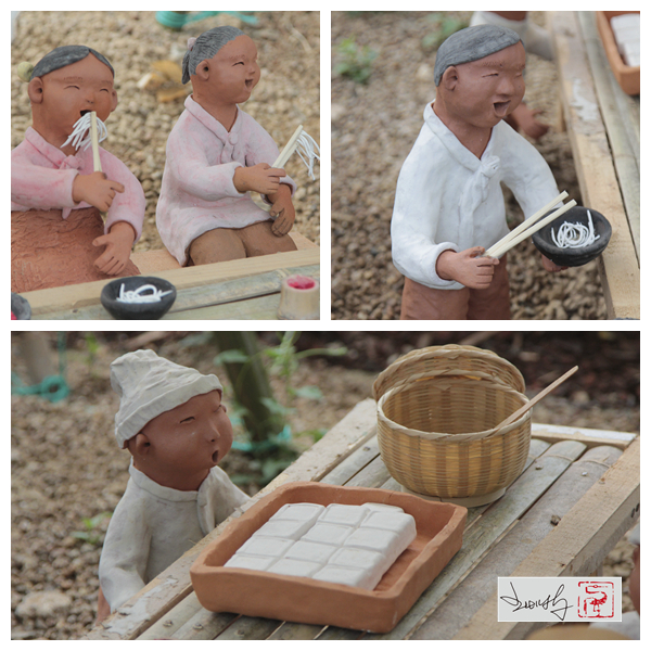 在韓國綠竹節展場裡,有一棟建築物名為地方文化館,佈展相當用心,當地生活藝術家的陶偶作品,以韓國當地昔日庶民生活為主題,按比例創作場景與人物,內容真是精采!樸拙的陶偶卻有著無比生動的表情,尤其是那個躺在戶外竹床抱著竹夫人的陶偶,臉部表情---唉,真是一個爽字了得啊! 完全一付帝力於我何有哉的神態-----生活,不就是如此嗎?努力耕耘,理直氣壯!讚
