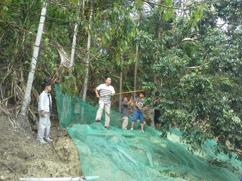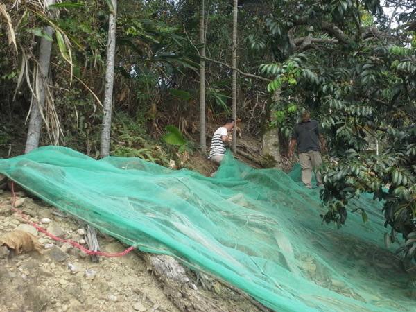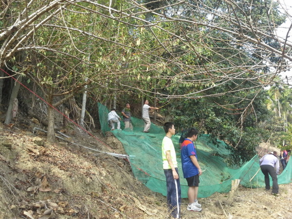 開工了,先綁網袋,以便回收敲下來的橄欖。