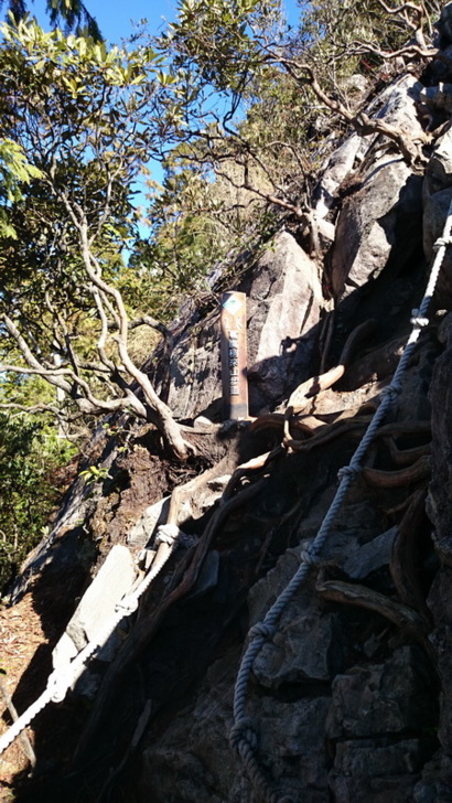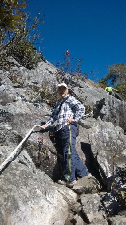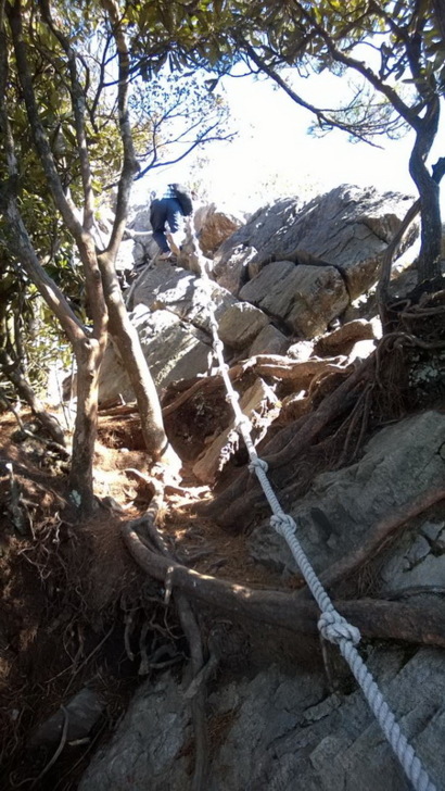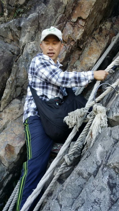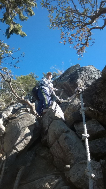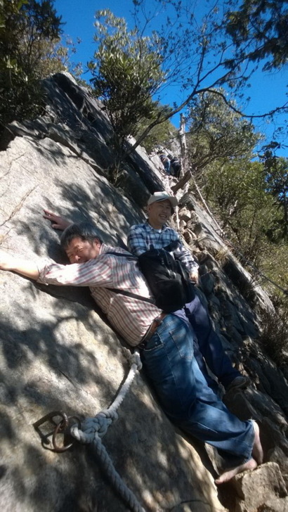 與上山截然不同的情況,要拉著繩索踩著石縫(ㄇ型鐵條),一步步往下攀爬。