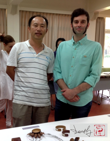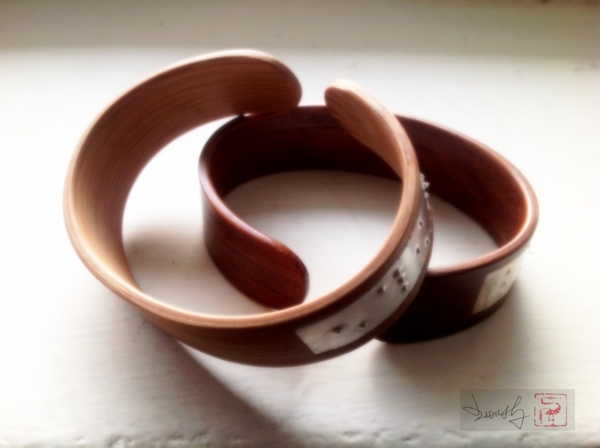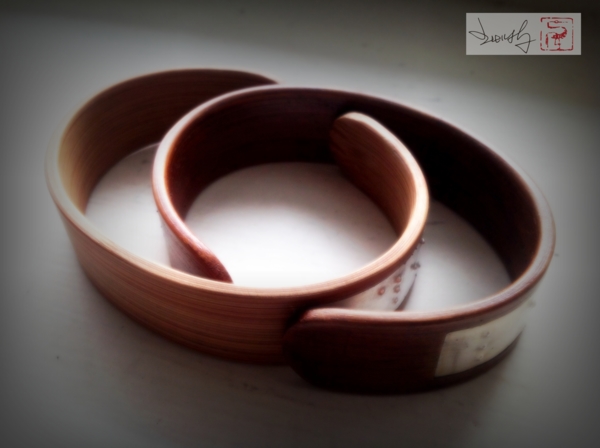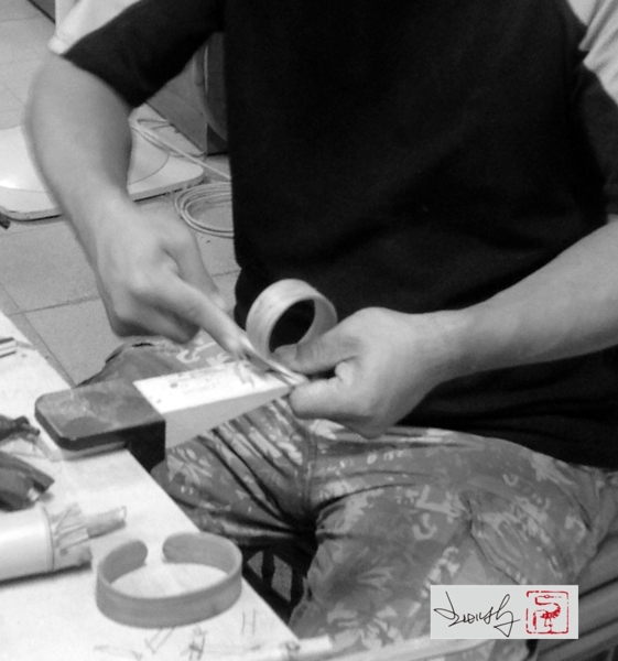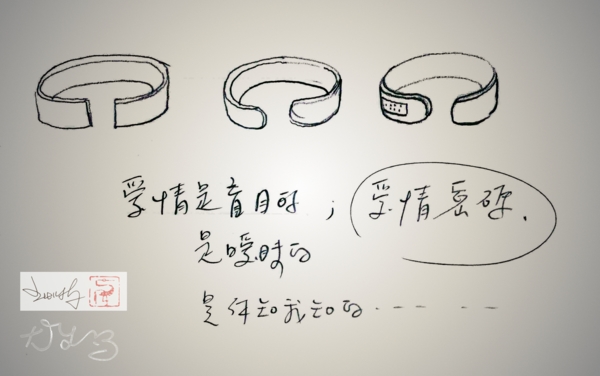 去年此時,凱鶴在與法國Hand in Hand組織,來台與竹工藝師合作研創『竹意飾,巴黎AFEDAP竹複合金屬飾品設計創作』交流創作中,他在創意發想一系列設計草圖裡,有一個手環,當時我靈機一動,建議在手環尾端鑲嵌上銀片,然後銀片上用點字圖案做出《 I LOVE YOU》,作品名稱就叫做:《愛情密碼》。