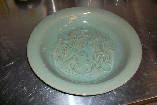 貓腳印刻了雙鳳大盤兒,因為擔心上釉會把刻花給蓋掉了,所以刻得特別用力特別深,上釉時... 還是擔心老問題,最終還是捨棄了最初心裡的打算,選擇了透明性較高的釉藥,孬啊....