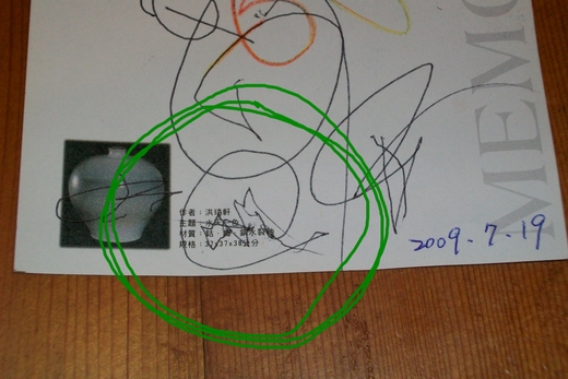 小Q再寫一次!再寫一次!Q爸一直叫小Q寫Q,無奈小Q手指頭小肌肉還無法做完善的控制,寫出來的Q總是極度隨心所欲,導致紙張被畫得更亂,連原本的Q圈圈裡頭都被畫得亂七八糟,貓腳印趕緊把紙張救起,綠色圈圈就是小Q人生第一個親筆簽名,Q媽在一旁細心的著名日期,說要拿去護貝。