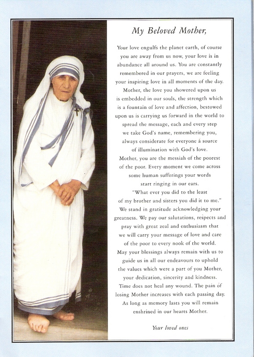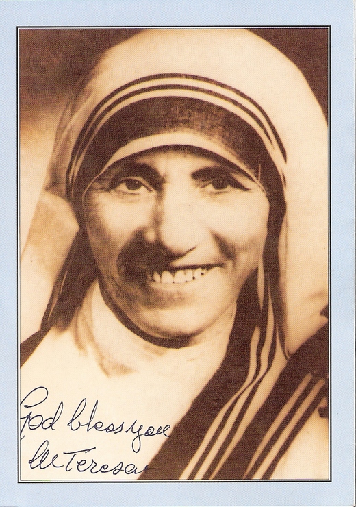 這張卡片是我們Nashik, Mother Teresa 收容所 (專門收容被親人遺棄的殘障與病重人士 .這些人大都是修女們每日開車出去在路邊檢回來的.) 中修女給我的, 她說是她僅有的一張將它給了我,