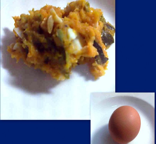 3.將南瓜和水煮蛋一起搗碎。為了保留口感,建議南瓜與雞蛋都還有部份塊狀。爾後