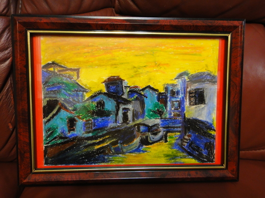 『你送我的生日禮物,我不曉得該送你甚麼?但我挑選我認為最好的最滿意的這幅〝晚霞〞蠟筆彩畫送給你,希望你會喜歡。』