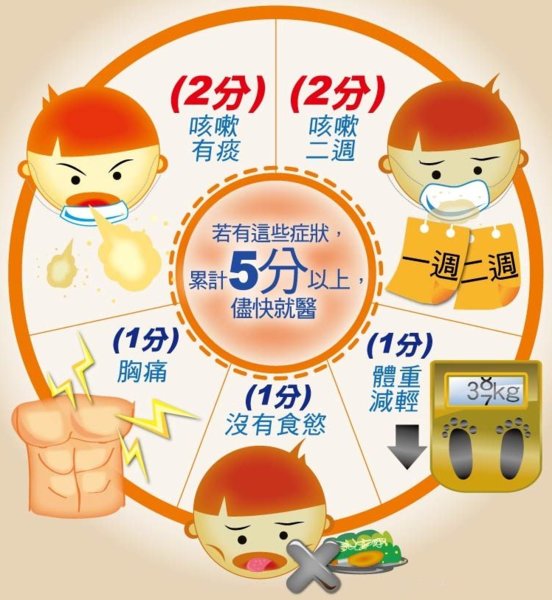 世界衛生組織公佈的簡易肺結核七分篩檢方法如下︰咳嗽兩週,有痰,體重減輕,沒有食慾,胸痛,如果你有上述症狀,建議趕快就醫檢查。