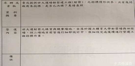 王鴻薇表示,5月時就詢問世大運場館招標進度,其中有18件標案會於6月完成決標作業。以射箭項目的體育大學田徑場為例,市府原訂於6月10日完成決標,但王鴻薇發現,該場地目前竟然還在細部設計,七月底才會上網公告。這18件標案別說決標了,連發包的影子都沒有!