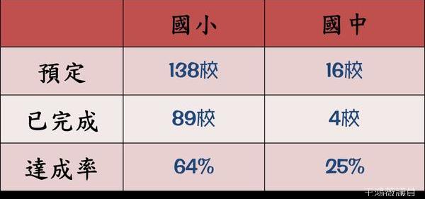 此外,今年北市優先選定裝設的12所國中同樣恐需延至10月底才能「建置完成」,截至8月只有民族、介壽、中山、興雅4校完成,達成率不到3成,大多數國中仍在沒有電子安全圍籬的狀態下迎接開學。