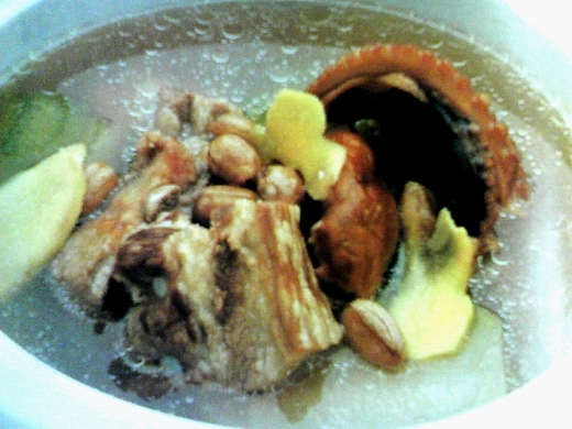 家庭食譜:節瓜章魚花生湯(4–5人份量) 材料: 節瓜…2個(約420克) 乾章魚1隻…約40克 唐排(或豬展)…(約300克) 花生…半杯 薑…3片 清水…2.8升(約10.5杯) 調味料: 鹽…適量 做法: [1]把節瓜刮皮、洗淨及切大件備用。 [2]花生浸軟,去衣及洗淨,瀝乾水備用。 [3]把章魚浸軟、洗淨唐排,一同飛水後再沖水及瀝乾備用。 [4]把清水注入煲內燒熱至水滾,將所有材料放入煲至大滾, 改用細火煲約1.6小時(或105分鐘)。 [5]加入調味即可飲用。 |
