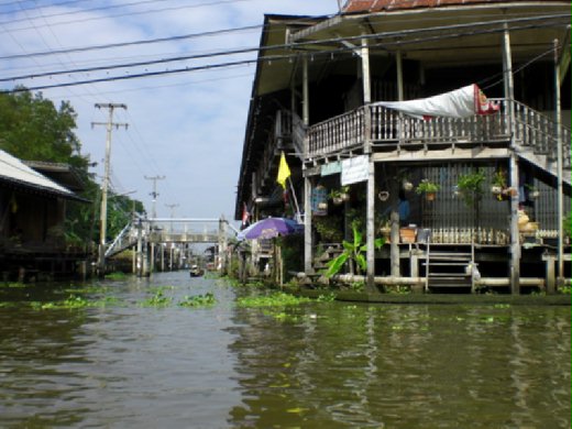 我延路也跟划船阿桑聊天,我問她是不是也住在水上市場旁的高腳屋呢?她說她不住在這附近。那些水上市場二側的高腳屋,真的出入只能用船,而且還有水有電,有自來水而不是用運河的髒水,房子裏的廁所應該也有化糞池吧。