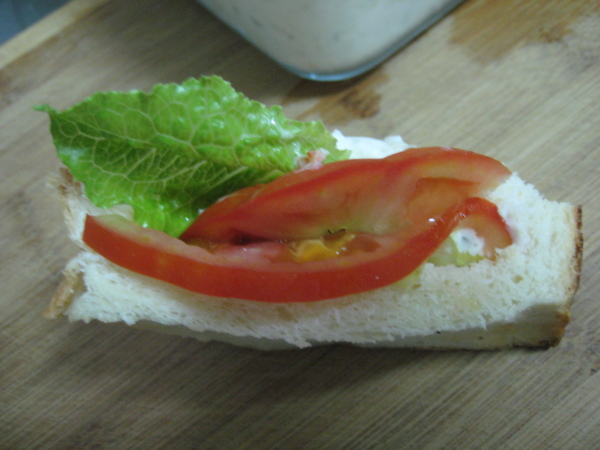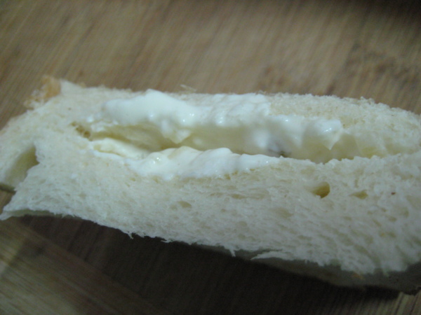 3.橫切面再以小刀切開.但不切斷的口袋狀.抹上塔塔醬