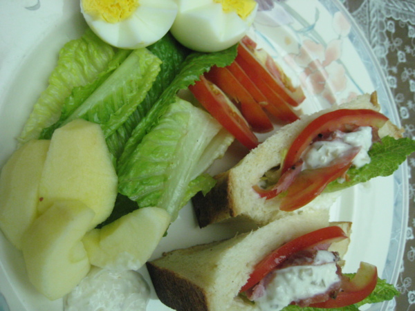 牛奶土司 、塔塔醬、生菜、紫洋蔥、牛番茄、蘋果、水煮蛋