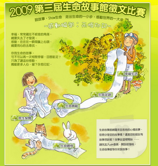 誠摯希望能邀請您參加臺北市政府民政局情繫「家」緣照片故事徵文活動,徵件時間自99年5月3日起至6月1日止,入選者(有二十名)可獲得價值7,000元數位相機,然後經過網路票選後選出首獎禮劵3萬元、第2名禮券2萬元、第3名禮券1萬,總獎額20萬元,最後還會編輯成書,歡迎台北縣市民眾以4張以內的照片和1,500字以內的文字,與大家分享值得留念的家庭故事(如家庭共同經營事業、多代同堂、育兒甘苦、家訓傳承、患難扶持及家庭趣事等皆可)詳情可參閱網址http://www.topwin.com.tw/populationpolicy/index02.html