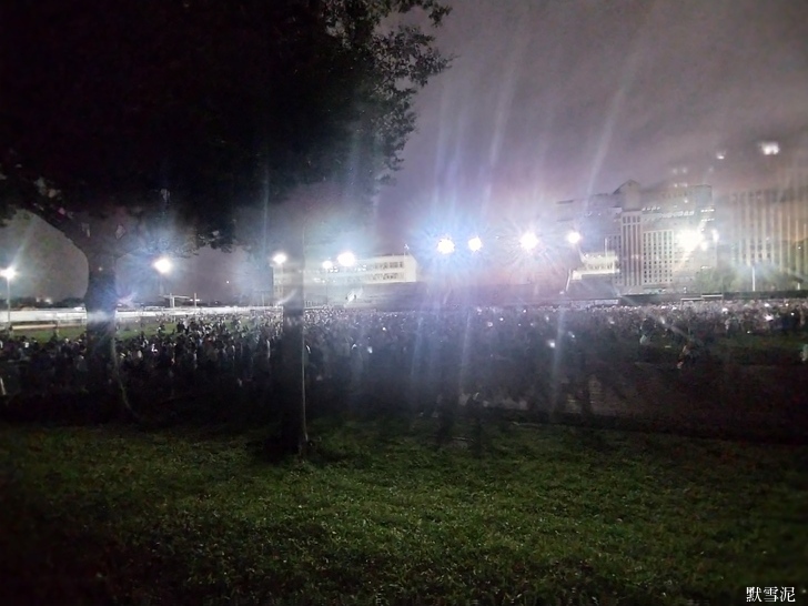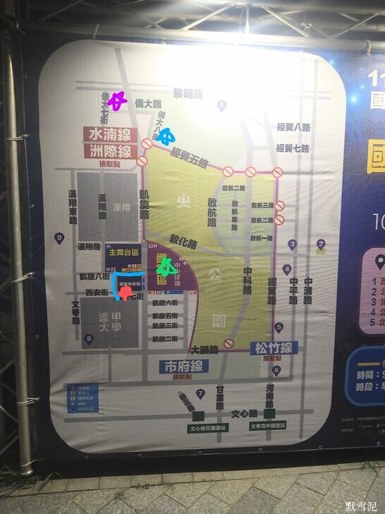 最後,建議家人,車子停到中清路和黎明路以外的範圍,別停進去。(我建議的地點是中清路的「愛買」,結果隔天聽朋友說→愛買頂樓是熱點)而我自己呢?我選擇台中市政府傳單上沒有寫的路線進去→穿越逢甲大學到西安路,然後順著凱旋八街走進舞台,結果當我抵達凱旋八街路口時發現它竟然交管到連人都禁入,我只好就地鋪上野餐墊,反正也很近而且容易撤退。