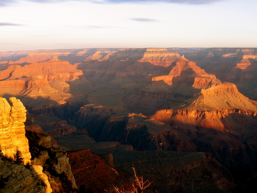 對了!說到日出,到大峽谷一定不要睡懶覺,記得向旅館櫃檯問日出時間和接駁車的時刻表,一定要去看日出時大峽谷顏色變幻的美景。你也可以參加日出遊覽團,不過自己坐車也可以到,免費的。看日出的景點可以選MATHER POINT或者YAVAPAI POINT,冬天時氣溫多為攝氏零下幾度,衣服一定要多穿幾層,圍巾帽子手套缺一不可。我們是在MATHER POINT。由於地勢較高(7000呎)所以日出是7:15。我們一夥人安靜的顫抖者等待曙光,忽然有一群身穿跆拳道衣服的美國青年也擠到我們旁邊,開始對著日出的方向比拳,還不時發出叱喝聲,一旁還有攝影師隨行,大概是想到此吸收天地精華吧!我還在暗暗稱讚著美國人體格真棒一點都不怕冷的時候,只見幾位團員已經凍得手腳不太聽使喚,團長見狀有點慌了,不等日出就匆匆收兵走人了,留下一堆錯愕的旁觀者。