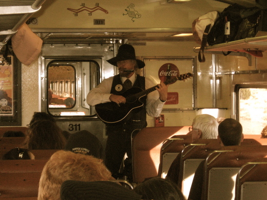 車掌先生叫馬克,馬克先生六呎多高,溫文儒雅(有照片為憑),是位爵士樂師,在火車上兼職已久,他說WILLIAMS原是個以伐木為主要產業的小鎮,距離大峽谷約一個小時車程,當地居民約3000人,生活樸實簡單,現在全鎮都靠大峽谷的過路客以及GRAND CANYON RAILWAY這條觀光路線維生。他在介紹WILLIAM時提到當地水源稀少,住在小鎮外圍的居民沒有自來水和電,電力主要來自太陽能,配合柴油發電機使用。水源必須自鎮上購買載回家中儲存,或者自行鑿井。由於地下水位於2700英呎之高度,所以鑿井得鑿至少2000呎深,由於當地是火山岩地形,如果鑿井時不幸太靠近幾百萬年前的岩漿噴火口(LAVA TUBE)的話,所有的努力都白費了。我們這些城市佬都覺得太誇張了,現代人還有這樣生活的嗎?