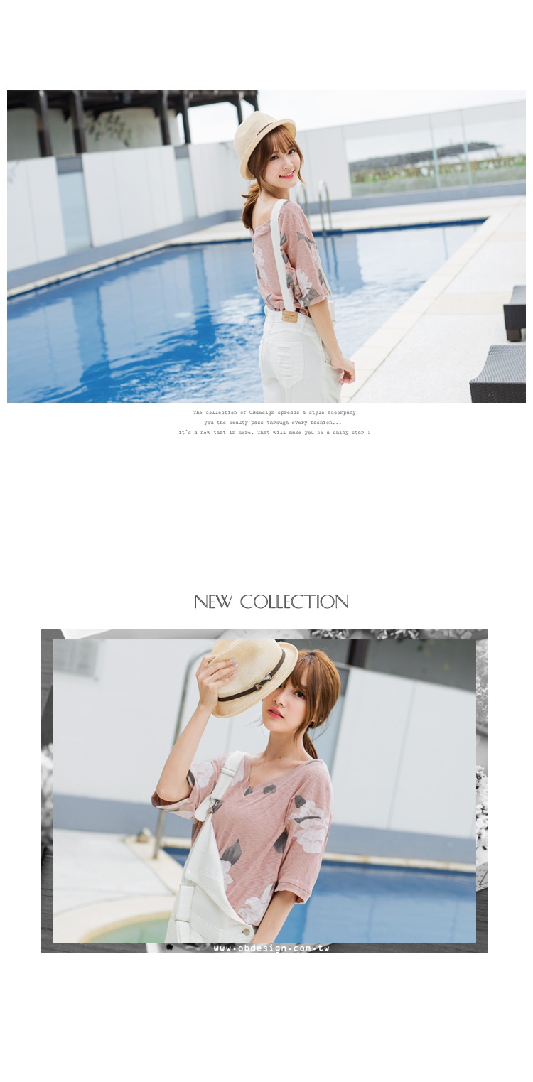 0608新品 玫瑰燙印花彈性透膚V領寬鬆連袖上衣.2色