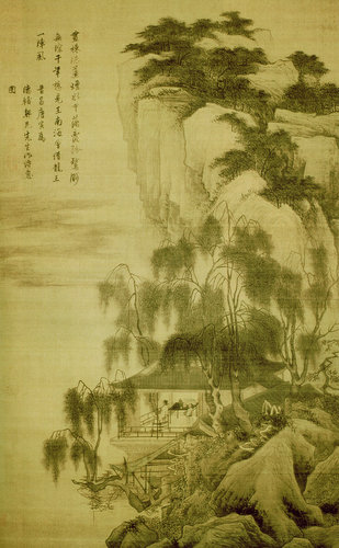 落霞孤鶩圖,明朝唐寅作。現藏於上海博物館!整幅畫的境界沉靜,蘊含文人畫氣質,且在落霞孤鶩圖的近景中,有一個人坐在樓閣中,遠望著落霞孤鶩,人物雖然很小,但是卻畫的很精緻,是一幅人與景物並重的山水畫,相當少見!