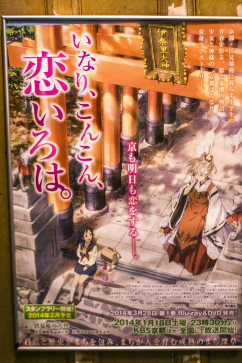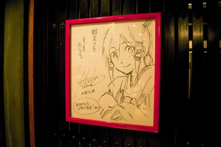 除了料理,店內的擺飾也很有特色,就跟店名的「蛙吉」一樣,店內擺設擺滿了非常多的青蛙擺飾,只要跟店家講一下,店內是可以拍照的;在日本的店內,拍照前最好都先問一下,而且基本上都禁帶外食,算是日本的基本禮儀。除了青蛙之外,也擺有《狐仙的戀愛入門》(いなり、こんこん、恋いろは。)的收藏品,大概是因為伏見稻荷就是《狐仙的戀愛入門》的聖地的關係吧。